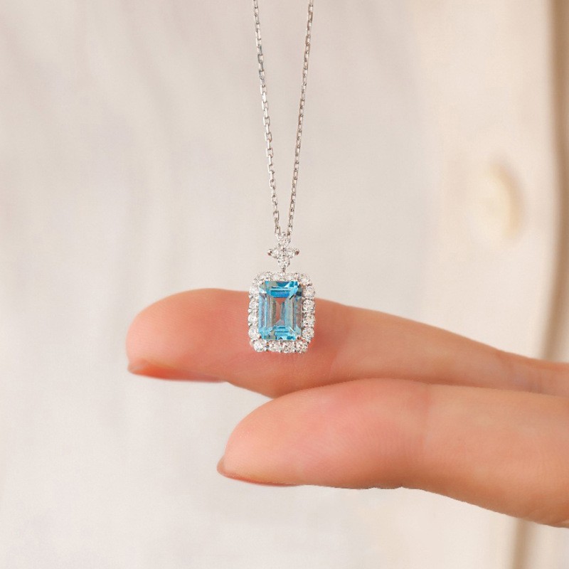 CAOSHI Sea Blue Rhinestone Silver Color Jewelry for Women Shiny Emerald Cut Crystal Rectangle Cubic Zirconia Pendant Necklace