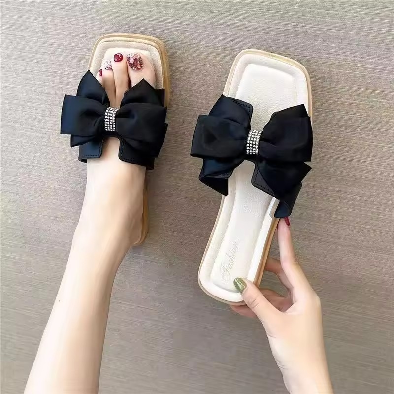 Women's Trendy Korean Style Summer Slippers New Fashion Outwear Heel Bow Sandals Light PVC Insole Anti-Slippery Spring Autumn